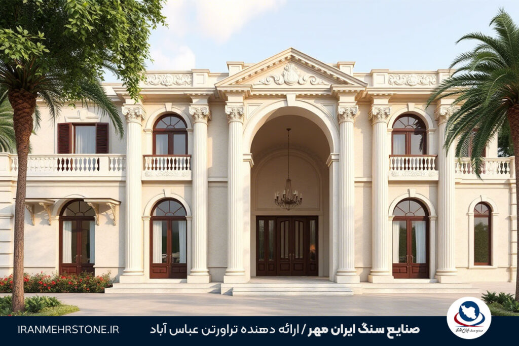 • جزئیات تزئینی مانند سرستون‌ها و تزیینات حجمی: این جزئیات به نمای ساختمان عمق و شکوه می‌دهند.